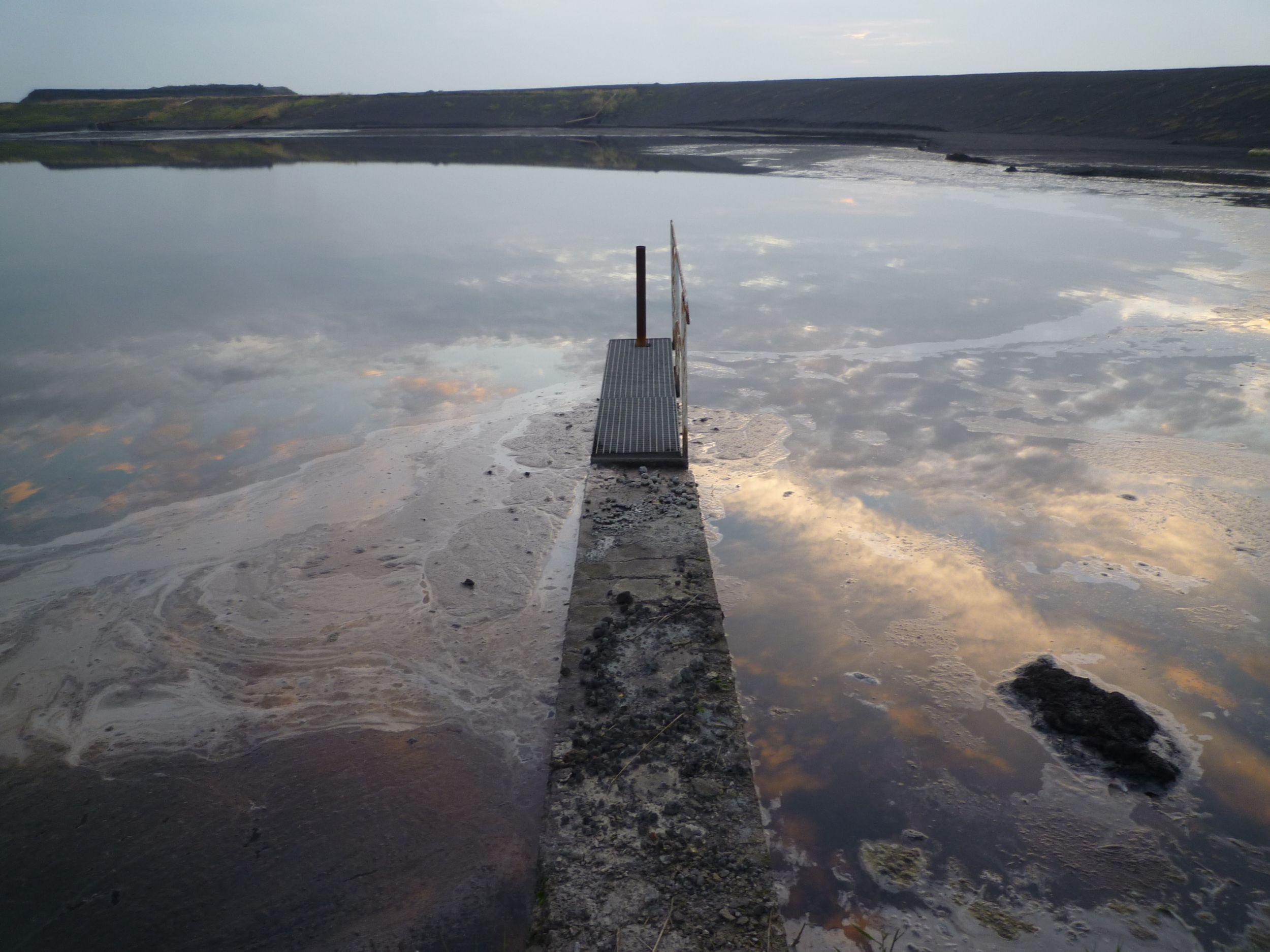 When you circle around the factory fence, a grassy meadow stretches upwards towards the heap-speckled landscape. Tufts of sharp orange grass are receding by the meter, making way for a desert biotope common around active volcanoes. When the Walker reaches the horizon he encounters sci-fi scenery: two great lakes in the vale below, separated by a thin dam. No trees as far as the eye can see, only small islands of squat shrubs here and there. Twins of tall concrete towers rise from the Black Lake’s waters. Reeds sway in rhythm along the steep banks. Kestrels and pigeons circle above the towers and ducks flock below, wild geese, an occasional swan, and a predator bird gliding below the clouds searching its prey.